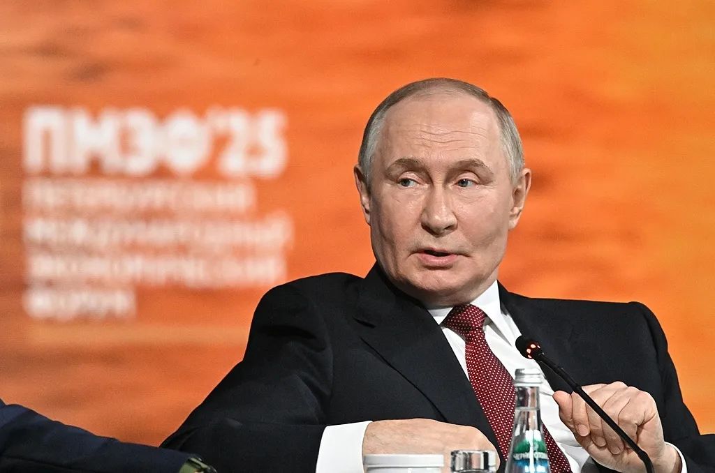 6月20日,俄罗斯总统普京出席圣彼得堡国际经济论坛全体会议。
